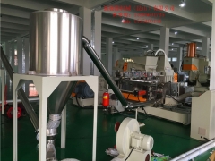 密炼机——自动提升机——推拉式锥双喂料机——双螺杆挤出机——单螺杆挤出机——液压板式自动换网——风冷模面热切造粒辅机——一级旋风分离器——二级旋风分离器----风冷振动筛(2.5m) ——风吹料仓一套